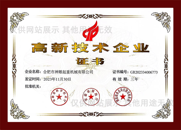 合肥神雕起重是高新技術企業,是安徽省科創(chuàng)板掛牌企業(證券代碼:630331),同時榮獲安徽市場質量、誠信五星級企業、合肥經濟圈示范企業、合肥市創(chuàng)新型企業、安徽省市場質量放心產品等榮譽稱號